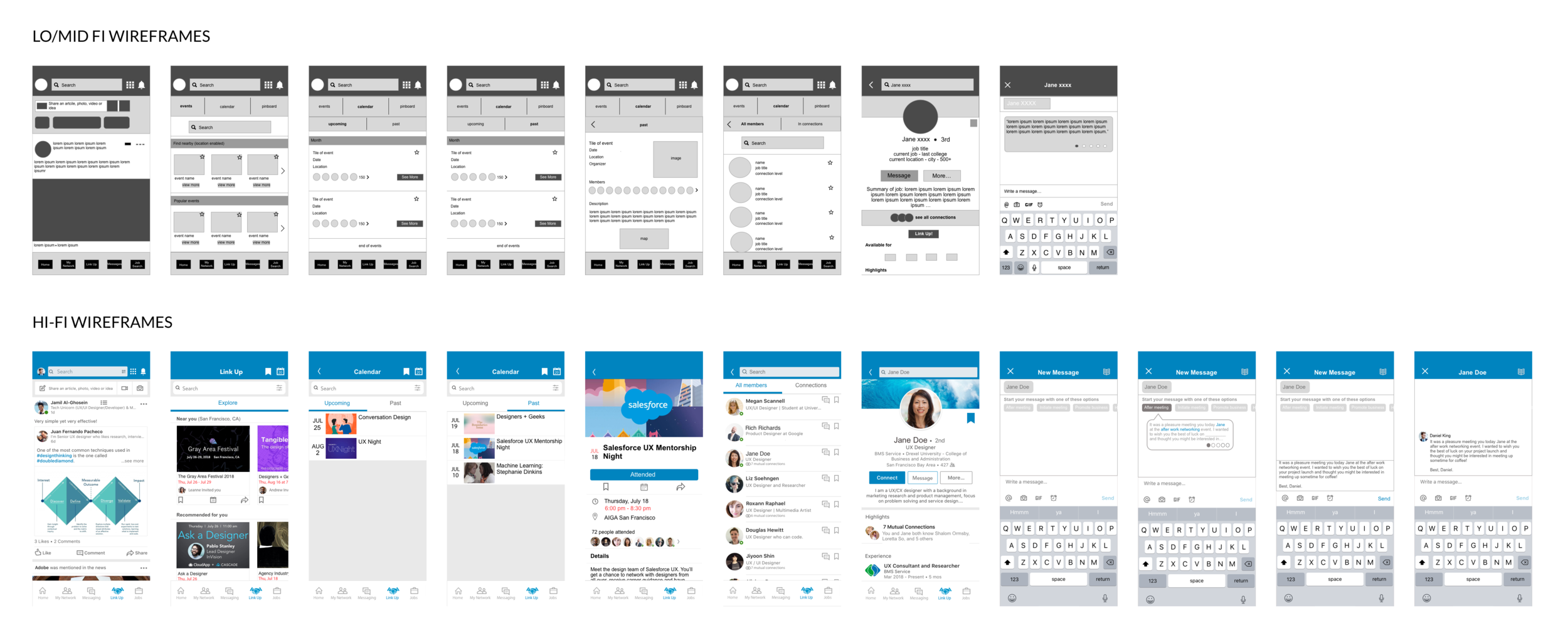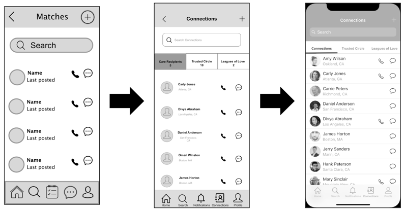 The wireframe development progression on Connections/Messaging