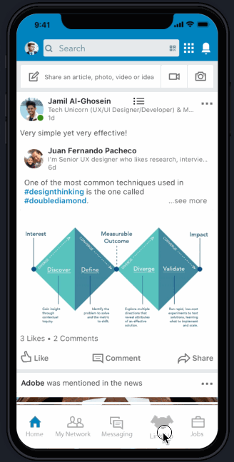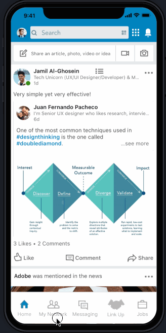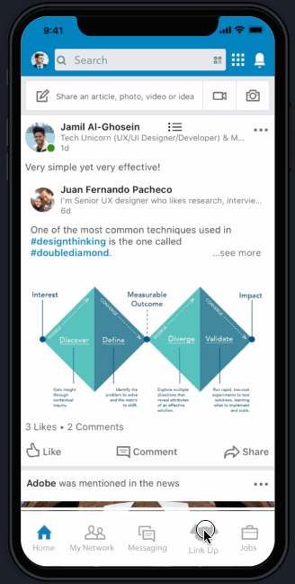 LinkedIn wants to increase user engagement by making the mobile app a one-stop destination for contact management and networking. Also, any design to key screens must use the current look and feel of the LinkedIn mobile app.