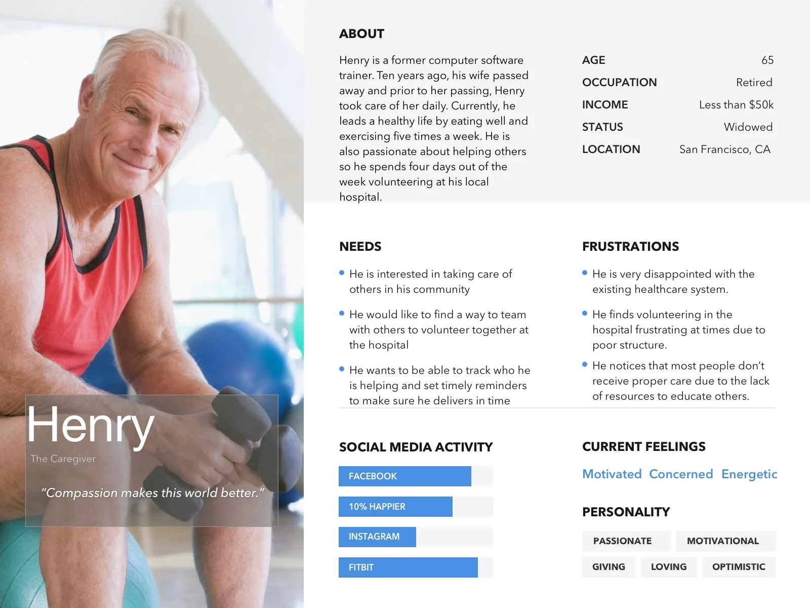 Once we gathered these insights into what our users felt about caregiving and care-receiving, I was able to create three personas for the target audience. Our primary persona is Henry who is the caregiver, the second is Omari who is the care-receiver, and third is Jennifer who is both the caregiver and care-receiver. The unique story and background of all three personas are a direct reflection of the users we interviewed and surveyed.