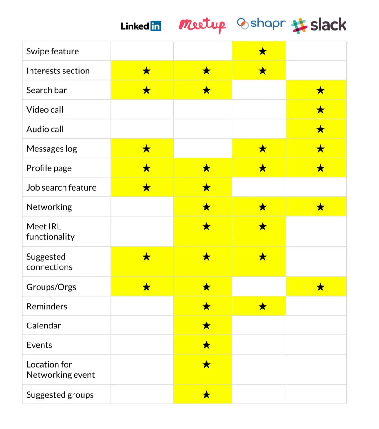 As there are no apps that combine the ability to apply for jobs and sign up for networking events, we selected features that other apps used for comparison.