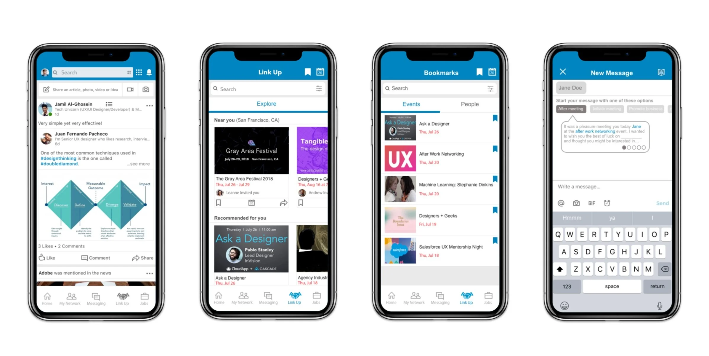 If you’ve ever attended a networking event, you probably found those events through Facebook, Meetup, Eventbrite or some other platform other than LinkedIn. Meeting professionals 1:1 is also relatively easy these days through Shapr and mutual connections. In all of this, where does LinkedIn come in? LinkedIn is one of the top contenders amongst Indeed, Glassdoor, and more when it comes to job searches with the benefit of connecting with other professionals. However, imagine a world where LinkedIn offered networking events and an efficient contact management as part of their services. Is that possible? Absolutely. This is what my team and I aimed to create through the addition of a new feature called Link Up that provides users with plenty of networking events, and an efficient contact management system to organize memorable data from events and networking with other professionals- all while having access to a plethora of jobs to apply to. Scroll below to see our process through design thinking, early to end stage wireframing, usability testing and interactive prototyping.